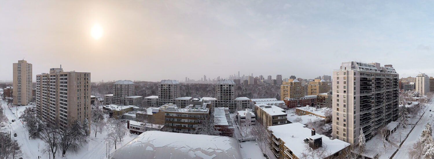 Midtown Light documents one year from a balcony in Davisville Village. The series features 40 panoramic sequences that showcase the neighbourhood’s light, weather, and character throughout 2023. Soon, forty-story towers will replace the tennis court and low-rises below. This part of Midtown is about to change forever.